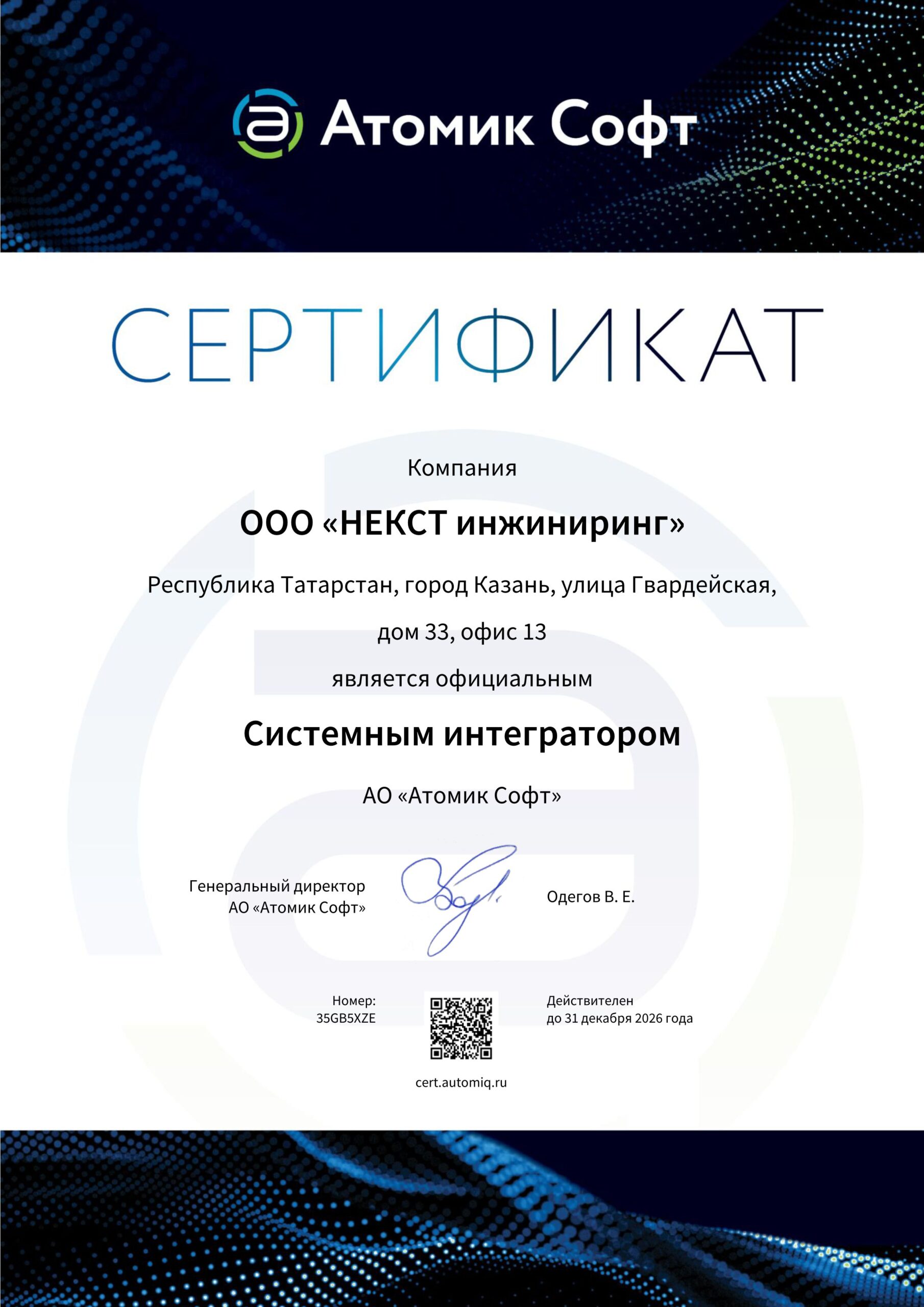 ООО «НЕКСТ инжиниринг» обладает партнерским статусом официального системного интегратора АО «Атомик Софт».