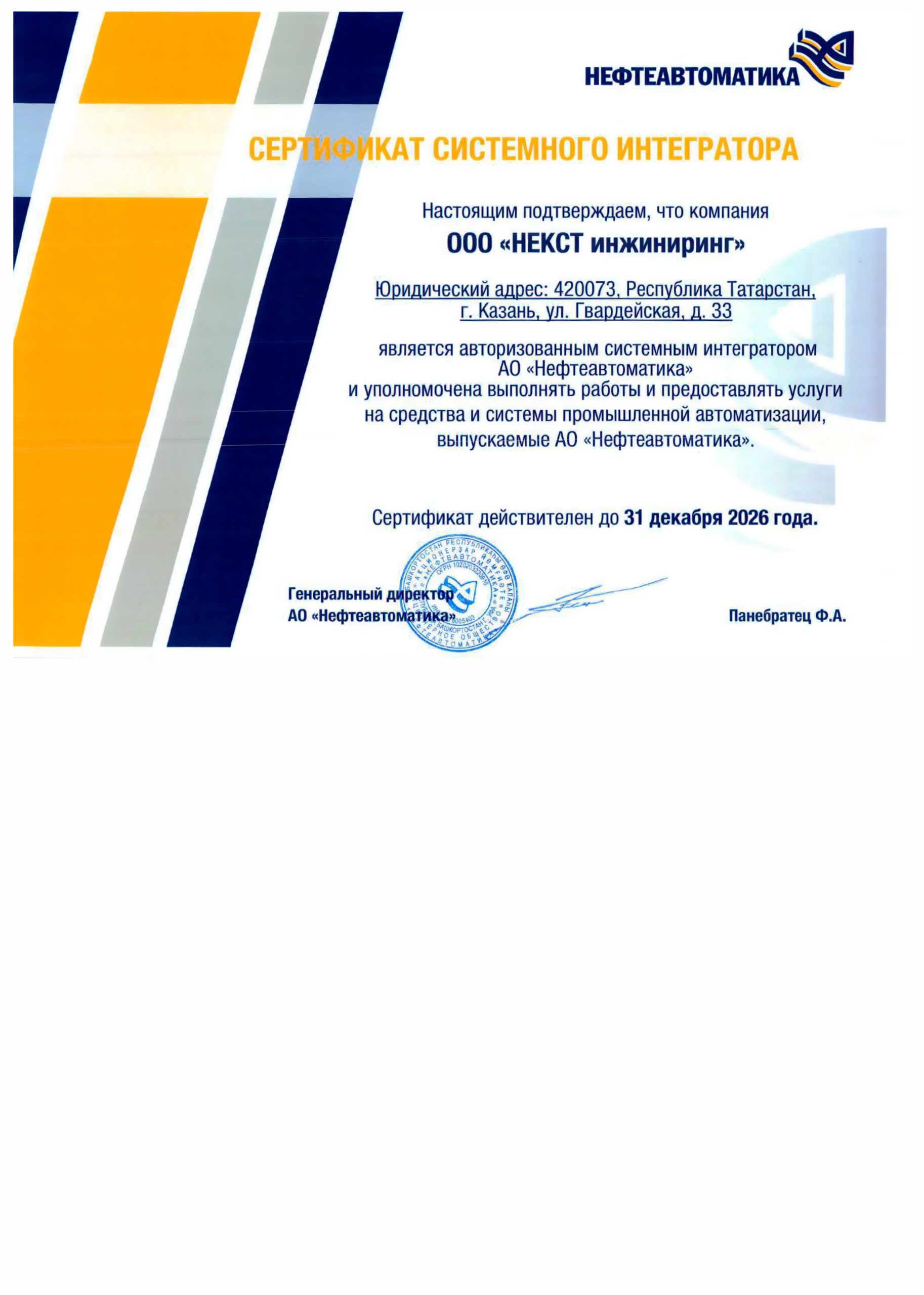 Компания «НЕКСТ инжиниринг» является авторизованным системным интегратором АО «Нефтеавтоматика» и уполномочена выполнять работы и предоставлять услуги на средства и системы промышленной автоматизации, выпускаемые АО «Нефтеавтоматика».